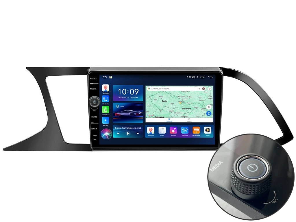 2DIN autorádio Everest EVE56 pro Seat Leon III nastavuje nové standardy ve světě multimediálních technologií. Na první pohled zaujme svou 9 palcovou QLED obrazovkou s neuvěřitelným rozlišením 1280 x 800. Lze na ní sledovat video i prohlížet fotografie s podporou Android aplikacemi. O špičkový výkon a plynulý běh aplikací se stará stabilní software s 8-jádrovým procesorem ve spolupráci se 6 GB RAM. Náročný posluchač jistě ocení funkci DSP neboli digitální signálový procesor, který násobně zvyšuje kvalitu reprodukce. Za pomocí 4G modulu se z Vašeho autorádia stane smartphone, ze kterého můžete hravě odesílat SMS zprávy, využívat online GPS navigaci s aktuální dopravní situací či využívat další cenné funkce. Váš mobilní telefon již zůstane navždy v kapse díky bezdrátové funkci CarPlay a Android Auto. Díky operačnímu systému Android 14 budete mít ve svém automobilu kompletní multimediální centrum přeplněné funkcemi a aplikacemi. Pohled z parkovací kamery Vám umožní bezpečné a ničím nerušené couvání. Autorádio nabízí možnost výběru z různých jazyků, které obsahují přeloženou základní část systému do českého jazyka.