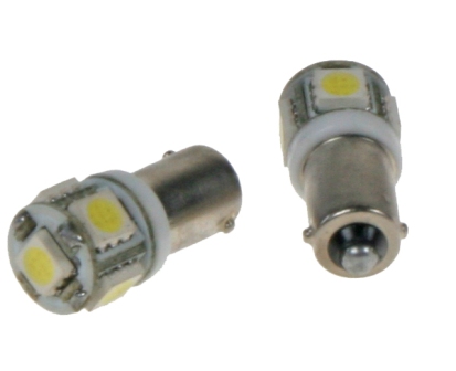 Náhradní LED žárovka s paticí BA9S, bílá, 5x vysocesvítivé 3-čipové SMD LED diody, napájecí napětí 12V, vhodná do parkovacích světel u starších vozidel. Svítivost LED diody je podstatně větší než u žárovky 12V 5W. Díky teplotě světla 8000 K jsou LED žárovky ideálním doplňkem do reflektorů s xenonovými výbojkami, kde žluté světlo obyčejné žárovky působí rušivě.