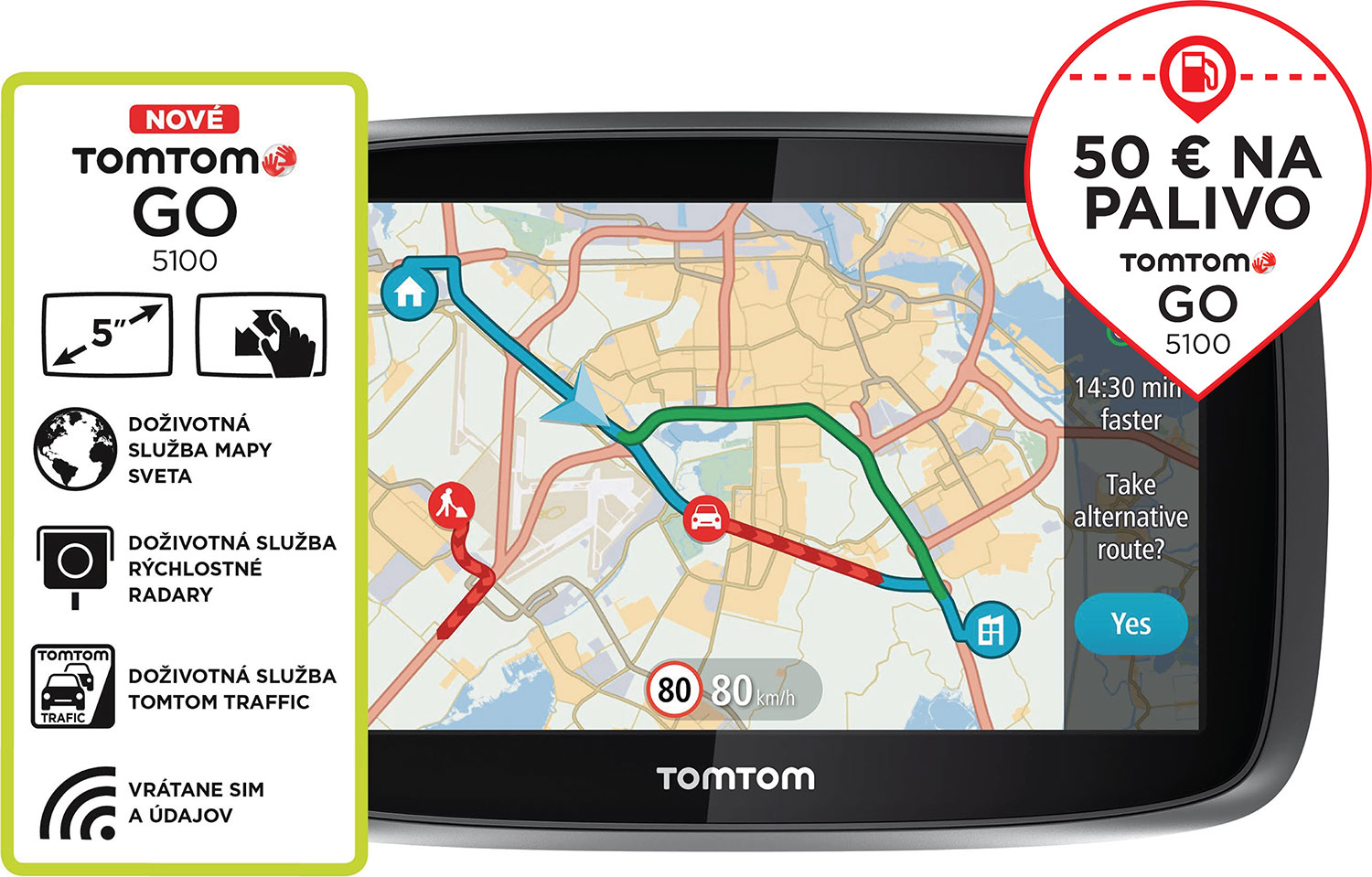 Kromě toho je každé zařízení TomTom GO 5100 vybaveno doživotními službami TomTom Traffic, Rychlostní radary a Mapy světa.