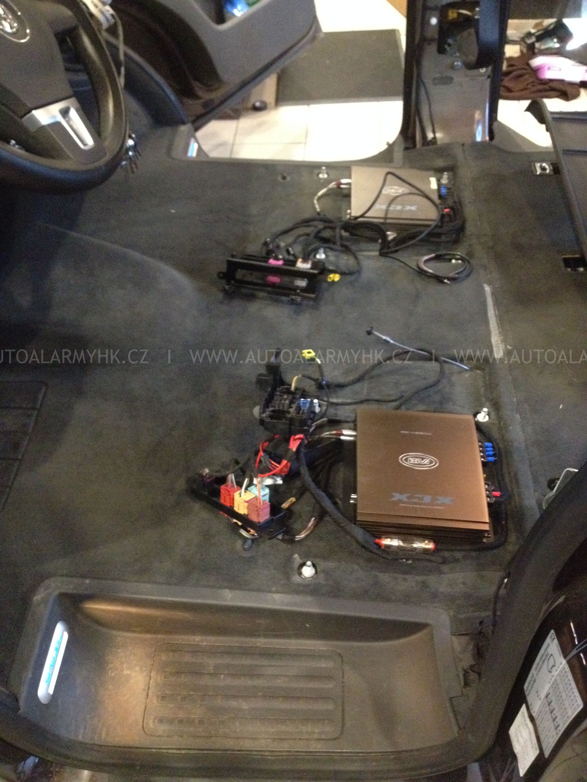 Instalace dvou 2-kanálových zesilovačů MB-X290W BOSCHMAN umístěnych pod předními sedačkami do vozu VW Multivan Special.